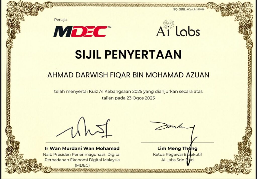 | Nama | :AHMAD DARWISH FIQAR BIN AZUA |